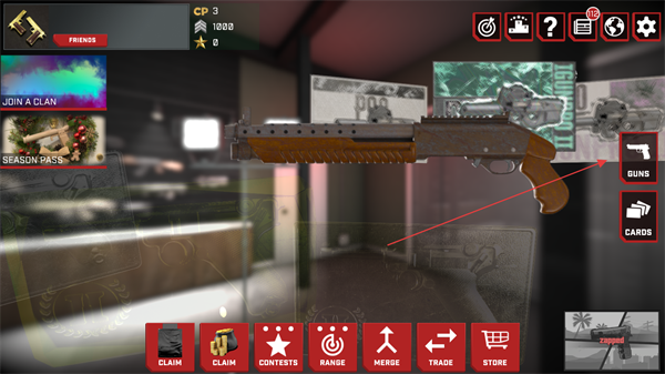1、進(jìn)入界面后點(diǎn)擊右側(cè)【GUNS】按鈕,可查看槍械庫,體驗(yàn)槍械。