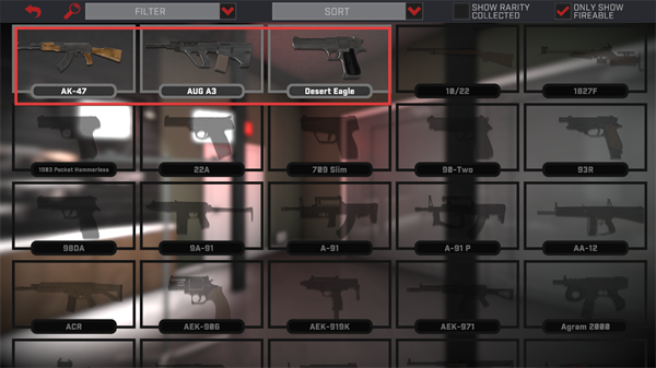 2、在槍械庫中可選擇【AK-47】【AUG-A3】【Desert-Eagle】等槍械,查看其對應(yīng)的屬性數(shù)值。
