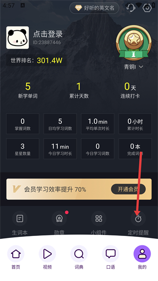 1、在學習類App首頁,點擊底部【我的】按鈕,可進入個人頁面,查看【新學單詞】-【累計天數】等學習數據統計信息。