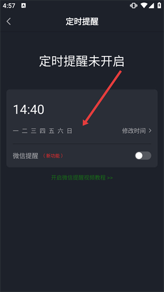 3、在【定時提醒】頁面,看到“定時提醒未開啟”提示,點擊【修改時間】選項,進入時間與日期的調整界面。