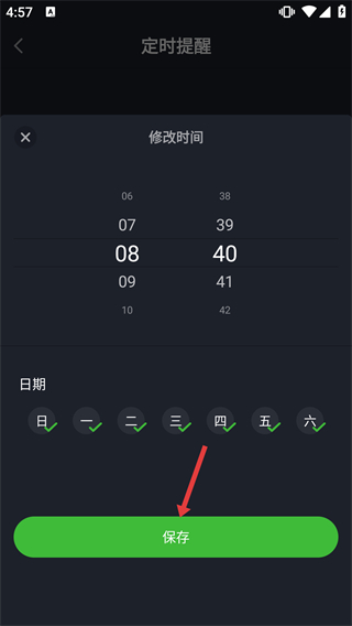 4、在【修改時間】界面,選好提醒時刻與重復日期后,點擊底部【保存】按鈕,完成定時提醒的配置。