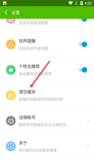 3、在設(shè)置頁(yè)面中,找到【清空緩存】選項(xiàng),該操作會(huì)刪除所有的問(wèn)題數(shù)據(jù),按需選擇執(zhí)行該操作。