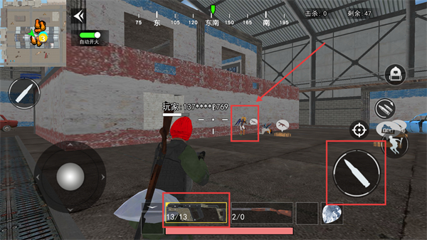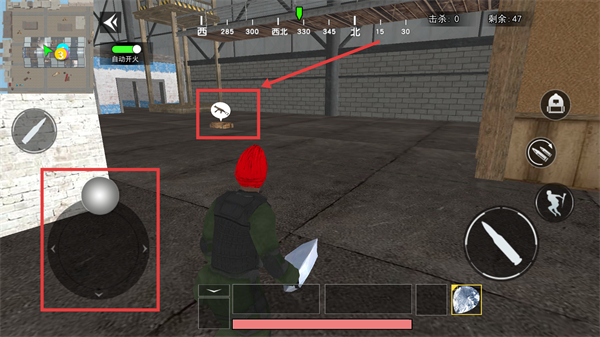 3、進入游戲場景后,通過左側移動搖桿控制角色移動,拾取場景內的武器道具(如槍支),武裝角色。
