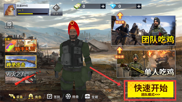 2、在主界面選擇【快速開始(團隊模式)】按鈕,進入團隊吃雞的游戲對局。