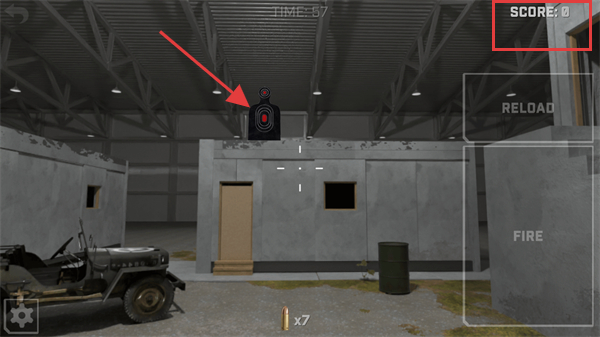 4、進入射擊關卡,瞄準目標點擊【FIRE】射擊,命中積累【SCORE】,彈藥不足時點擊【RELOAD】補充。