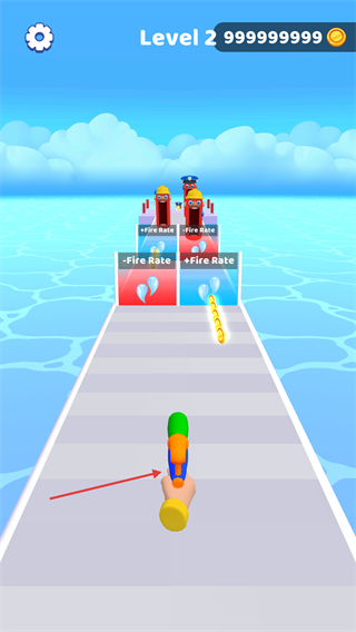 2、在【Level-2000000005】關卡,瞄準前方的目標使用【水槍】射擊,同時收集路徑上的【金幣】,推進關卡進度。