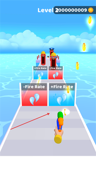3、進入【Level-2000000009】后,依舊優先拾取【+Fire-Rate】的增益道具,維持【水槍】的高射擊效率,同時收集沿途【金幣】。