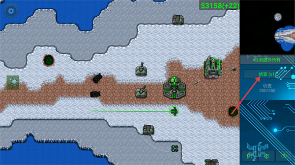 3、打開右側功能欄,制造偵查車,操控己方單位向目標區域轉移,調整作戰布局。