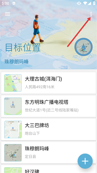 1、進入軟件后可查看【目標位置】列表,包含【大理古城-洱海門】等地點,點擊右上角三點按鈕可展開操作選項。