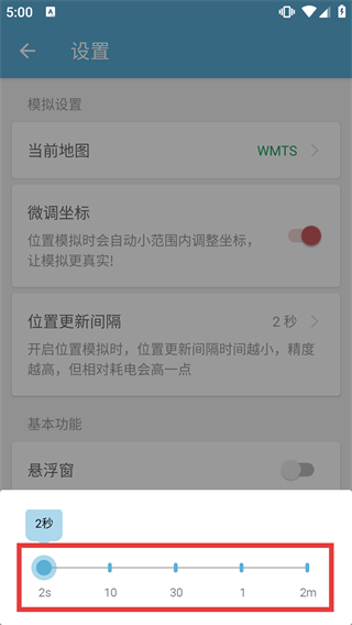 4、在【設置】的模擬設置中,點擊【位置更新間隔】,通過滑塊調整更新時間,時間越小精度越高但耗電增加。