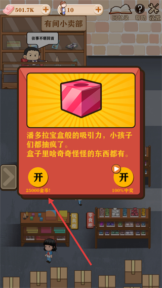 4、點擊【潘多拉盒】圖標,消耗金幣選擇【開】,可抽取各類物品,豐富小賣部的經營資源。