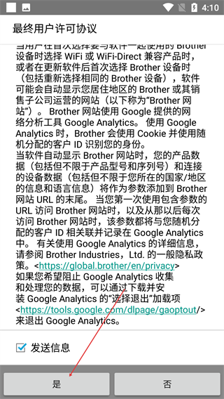 1、在最終用戶許可協議彈窗中,勾選“發送信息”后點擊【是】,確認協議并進入應用。