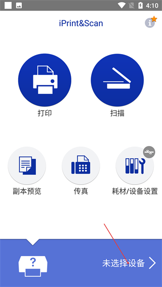 2、進入iPrint&Scan主界面,點擊底部“未選擇設備”,進入設備選擇頁。