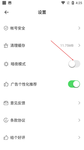 3、在設置頁找到“暗夜模式”開關,點擊開啟或關閉該功能,切換界面顯示模式。