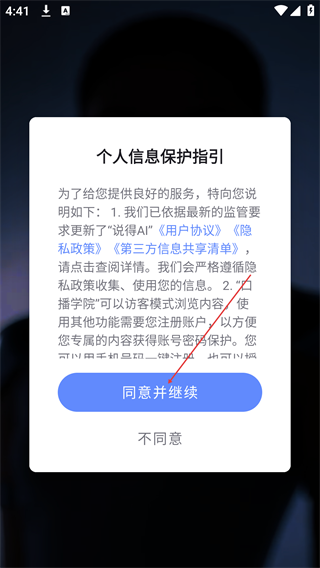 1、在個人信息保護指引彈窗中,點擊【同意并繼續】,確認協議后進入應用主界面。