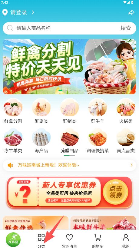 1、首頁分類導航直觀,以圖標網格形式清晰展示鮮禽類等各大品類,點擊即可快速進入對應商品列表。