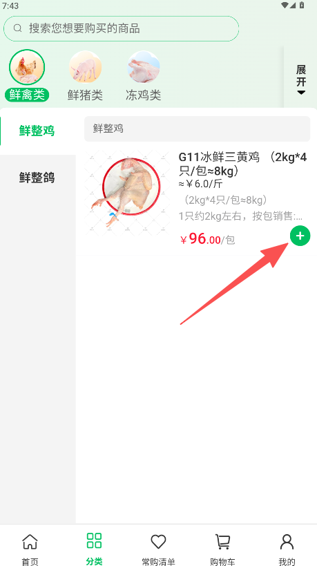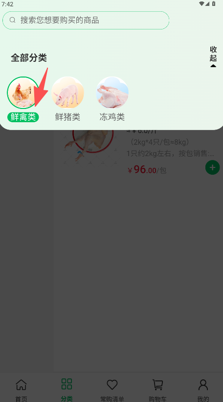 2、點擊可瀏覽該分類商品“鮮禽類”圖標。