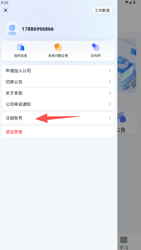 2、進(jìn)入“工作職責(zé)”界面并下拉找到“注銷賬號”選項(xiàng)。