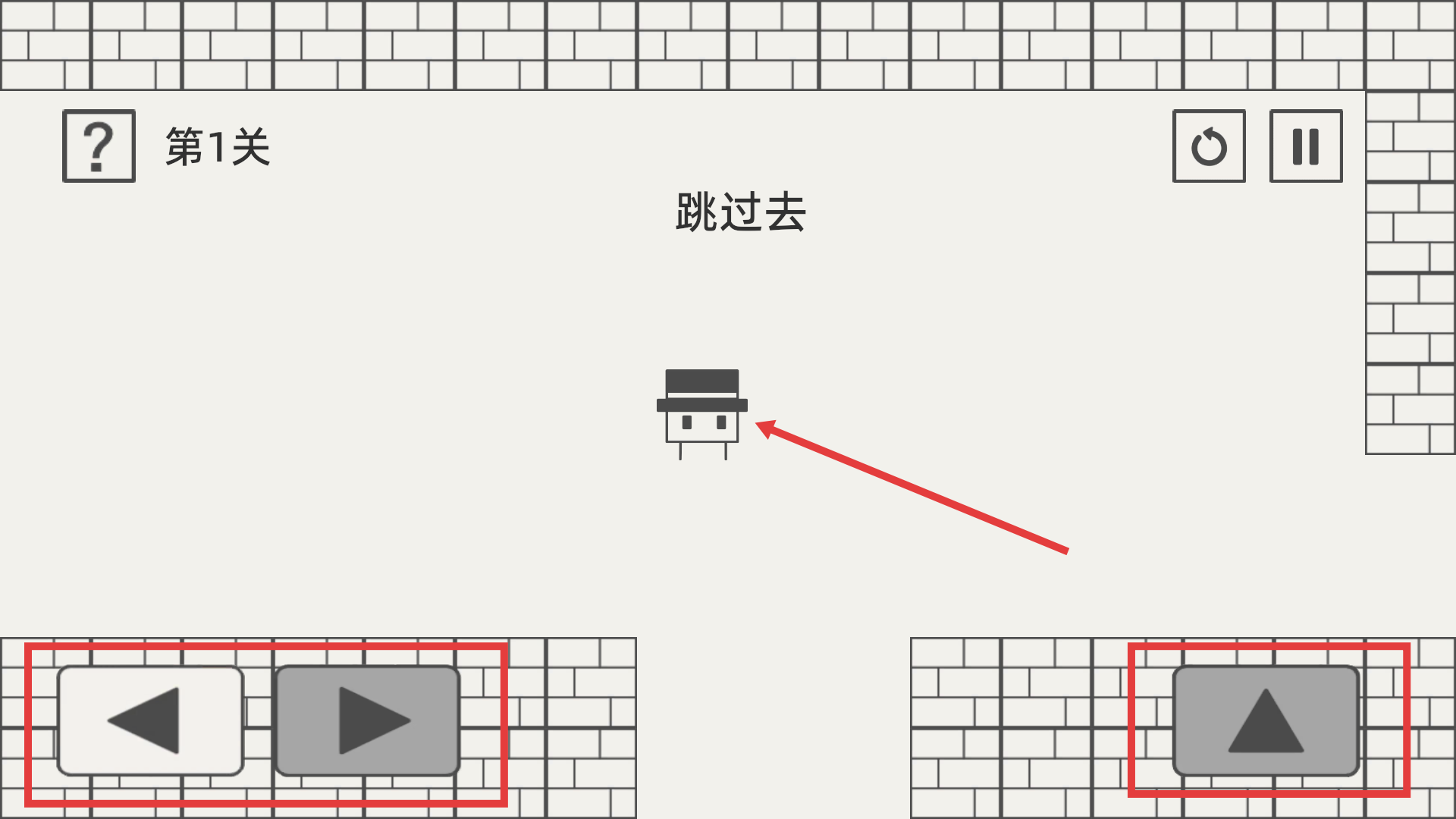 1、在第1關(guān)界面,通過左右方向鍵控制角色移動,再點擊向上鍵讓角色跳至目標(biāo)位置,完成“跳過去”的關(guān)卡要求。