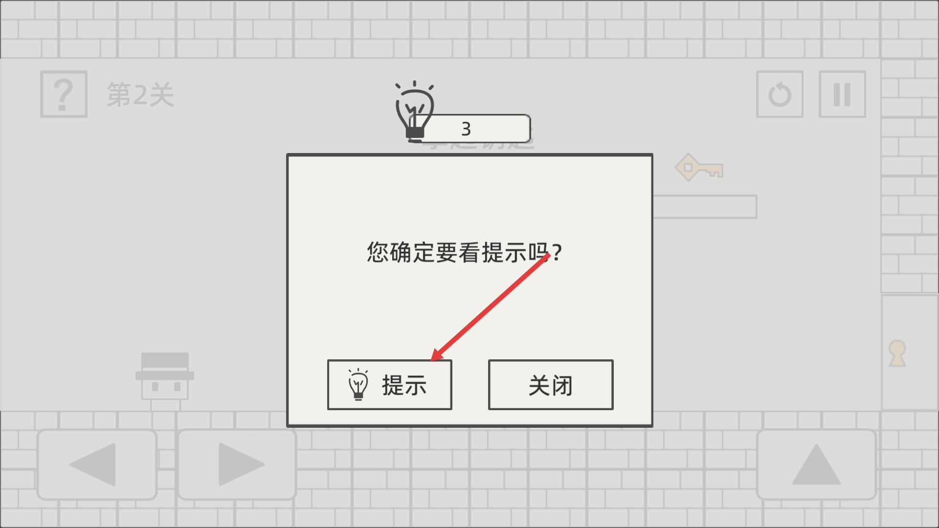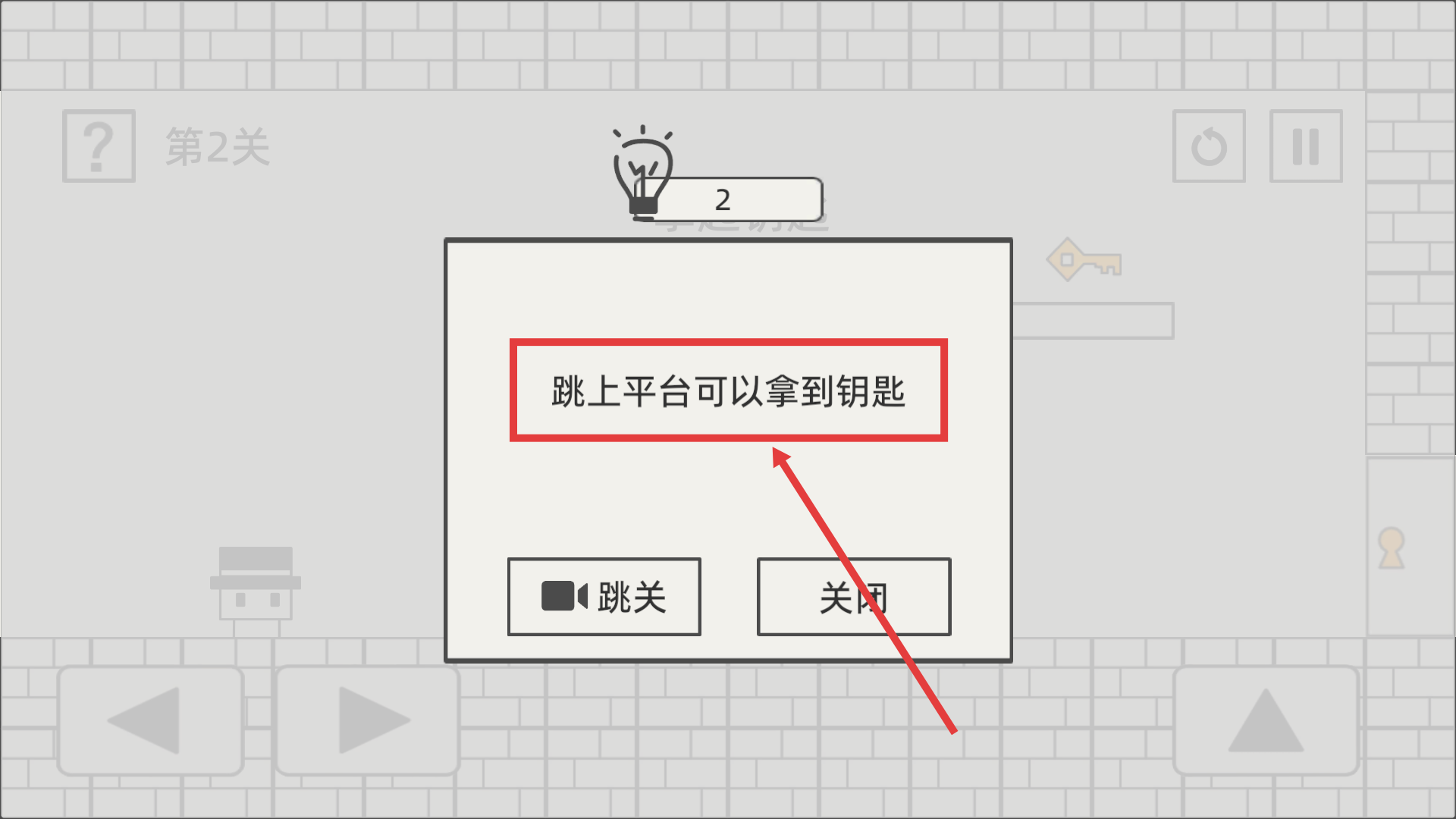 4、提示內(nèi)容顯示“跳上平臺可以拿到鑰匙”,依據(jù)該線索操控角色跳上對應(yīng)平臺,即可獲取鑰匙推進關(guān)卡。