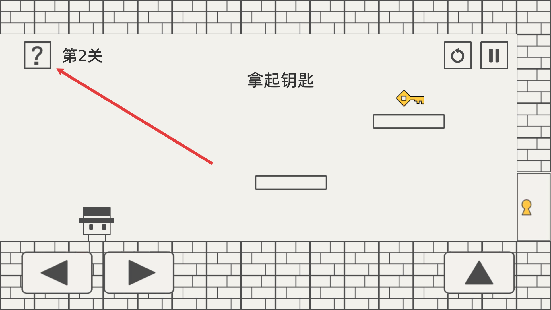 2、第2關(guān)目標(biāo)是“拿起鑰匙”,界面顯示鑰匙在高處平臺,可利用方向鍵操控角色移動,配合跳躍動作靠近鑰匙。