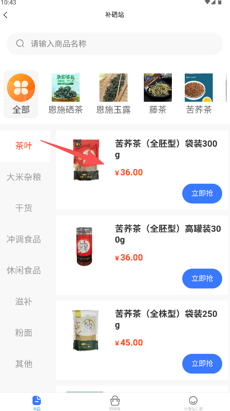 2、進入“補硒站”頁面后在分類中選擇目標(biāo)品類如“茶葉”。