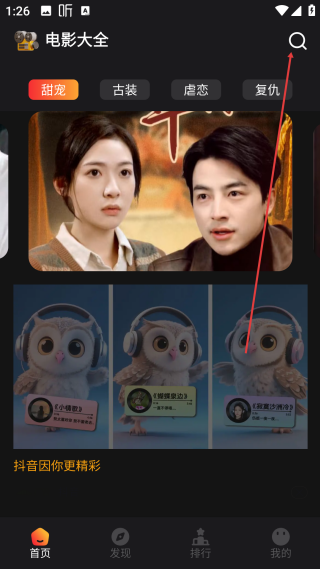 1、進入電影大全頁,點擊【右上角搜索圖標(biāo)】,進入搜索的功能界面。