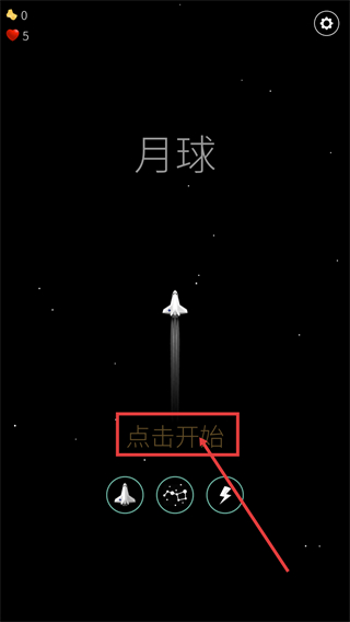 1、進(jìn)入【月球】主題的游戲界面后,點(diǎn)擊【點(diǎn)擊開(kāi)始】按鈕啟動(dòng)游戲,同時(shí)可通過(guò)界面圖標(biāo)調(diào)整飛船相關(guān)功能。