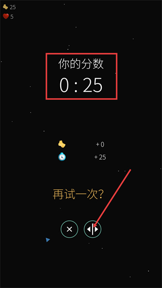4、結(jié)算界面會(huì)顯示你的分?jǐn)?shù),本次獲得0:25的時(shí)長(zhǎng)成績(jī),可點(diǎn)擊對(duì)應(yīng)按鈕選擇再試一次來(lái)刷新成績(jī)。