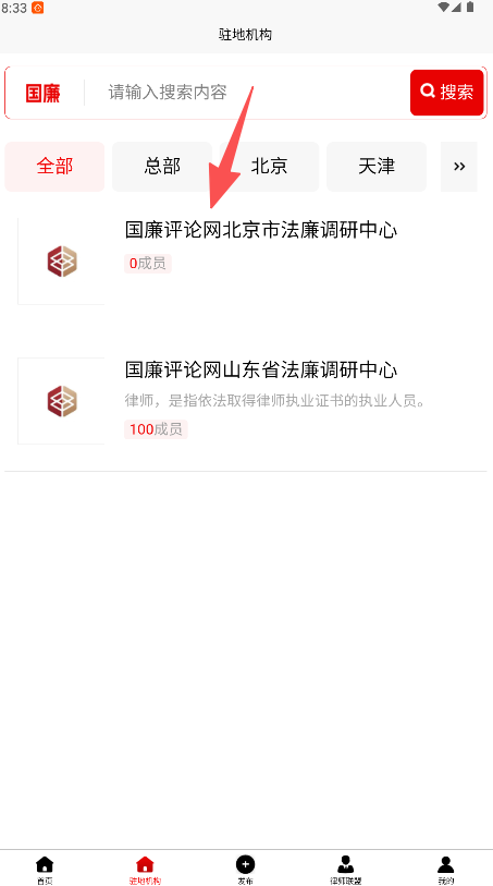 2、在機構列表中選擇目標機構如“北京市法廉調研中心”。