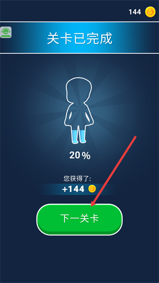 4、關卡完成后,可獲得【+144】金幣獎勵,點擊【下一關卡】按鈕,進入新的關卡繼續挑戰。