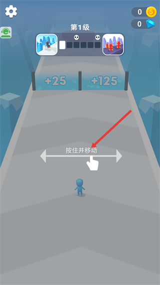 1、處于【第1級】界面時,執行【按住并移動】操作,控制角色觸碰【+25】和【+125】區域,積累數值推進關卡。