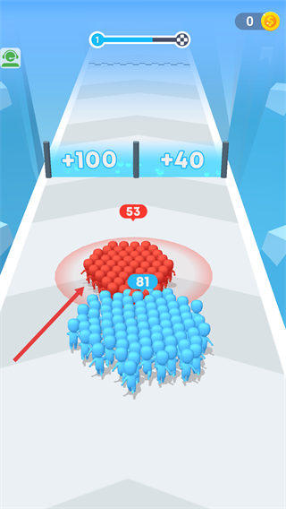 3、遇到敵方群體時,先觸碰【+100】區域強化自身,再與敵方對抗,利用數值優勢(如【81】對【53】)擊敗對手。