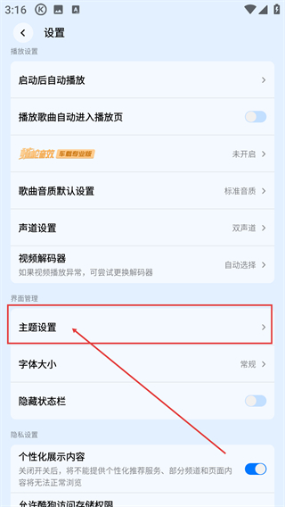 3、進入【酷狗音樂】設置頁面后,找到【主題設置】選項點擊,可進入界面外觀相關的設置界面調整顯示風格。