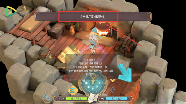 1、根據任務提示點擊門外出探索,收集【兔肉】與【魯阿葉】,為后續料理合成做準備,提升生存能力。