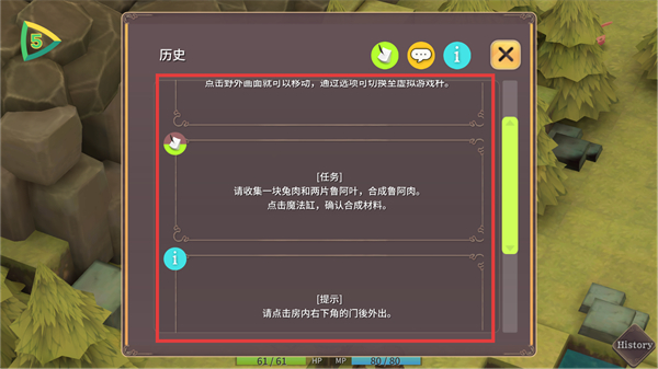 3、打開【歷史】界面查看任務指引,確認合成【魯阿葉】的材料需求,按提示推進劇情與探索進程。