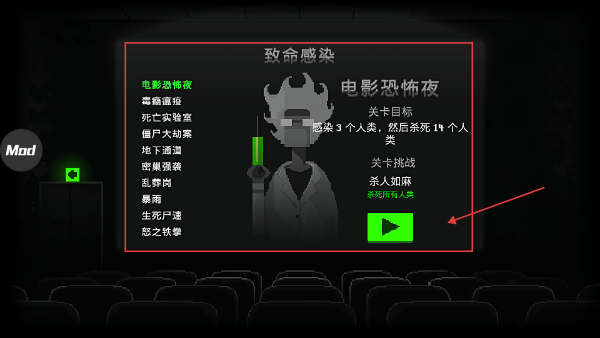 1、進入【致命感染】-【電影恐怖夜】關卡,點擊綠色播放鍵開始游戲,按目標感染3人后擊殺剩余人類。