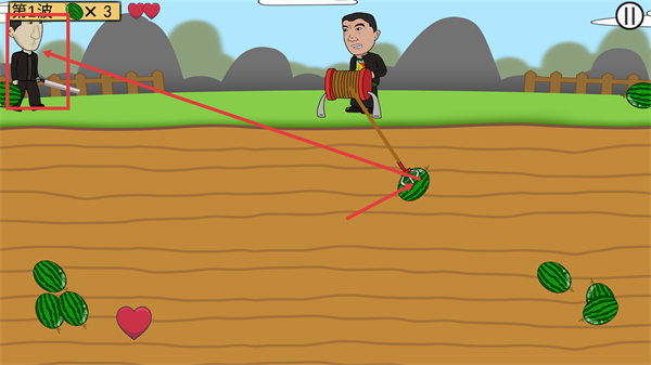 1、【第1波】關(guān)卡中,操控工具抓取地下的【西瓜】,積累數(shù)量完成波次目標(biāo),同時(shí)留意愛心血量。
