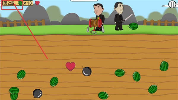 4、完成【第1波】后進(jìn)入【第2波】,此時(shí)西瓜數(shù)量目標(biāo)升至10,還需避開地下的炸彈類障礙。