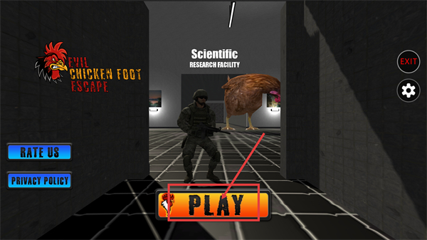 1、在游戲啟動界面點擊【PLAY】按鈕,進入【EVIL-CHICKEN-FOOT-ESCAPE】的【Scientific-RESEARCH-FACILITY】關卡。