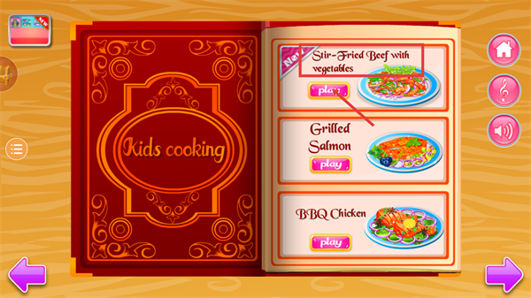 1、在【Kids-cooking】界面選擇【Stir-Fried-Beef-with-vegetables】,點擊對應的【play】按鈕進入該菜品的制作關卡。