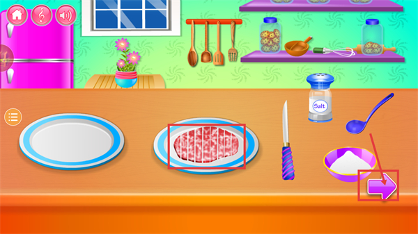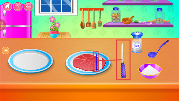 2、制作菜品時,先點擊【刀】工具,按照指引切割盤中的牛肉,完成食材的預處理步驟。