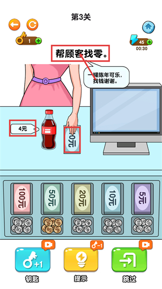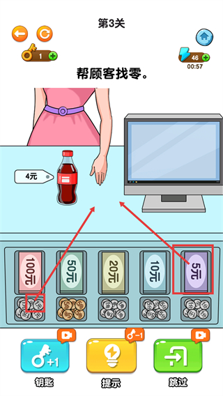 2、第3關需完成【幫顧客找零】任務,商品定價【4元】,顧客支付【10元】,需計算找零金額后選擇對應貨幣。