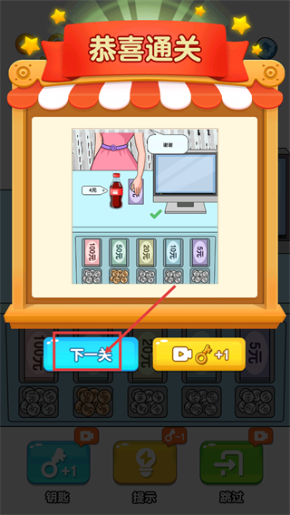 4、通關后點擊【下一關】繼續(xù)挑戰(zhàn),也可觀看視頻獲取【鑰匙+1】獎勵,積累資源助力后續(xù)開店運營。