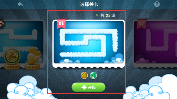 1、進入【選擇關(guān)卡】界面選定【06】關(guān)卡后點擊【開始】按鈕,可借助界面內(nèi)道具助力應對共25波挑戰(zhàn),快速開啟游戲進程。