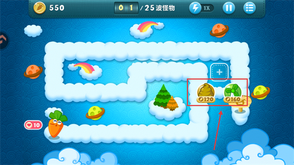 2、游戲中點擊右側(cè)【120】-【160】的道具圖標,花費對應金幣放置路徑旁,能有效阻攔怪物推進,提升闖關(guān)成功率。