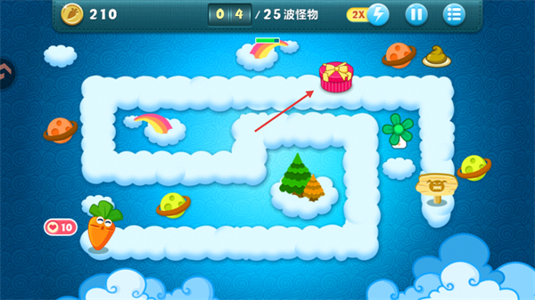 3、闖關(guān)時留意路徑上方禮盒,點擊獲取后得隨機獎勵,補充資源或道具,為后續(xù)應對更強怪物波次做準備。