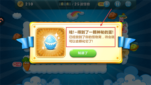 4、打開禮盒后獲得【神秘的蛋】,它自動放入怪物窩,后續(xù)孵化可解鎖新助力,增強關(guān)卡防御與戰(zhàn)斗能力。