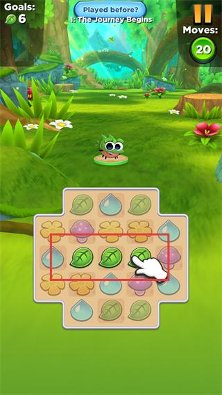 2、根據提示拖動相同圖案(如綠葉)進行消除,當前目標需消除6個對應元素,剩余步數20步。