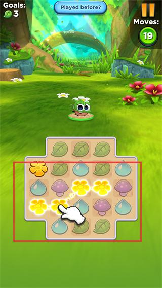3、通過【滑動】屏幕,使【三個及以上相同】圖案連成一線,觸發消除,消除圖案可對鼻涕蟲造成傷害并收集樹葉。